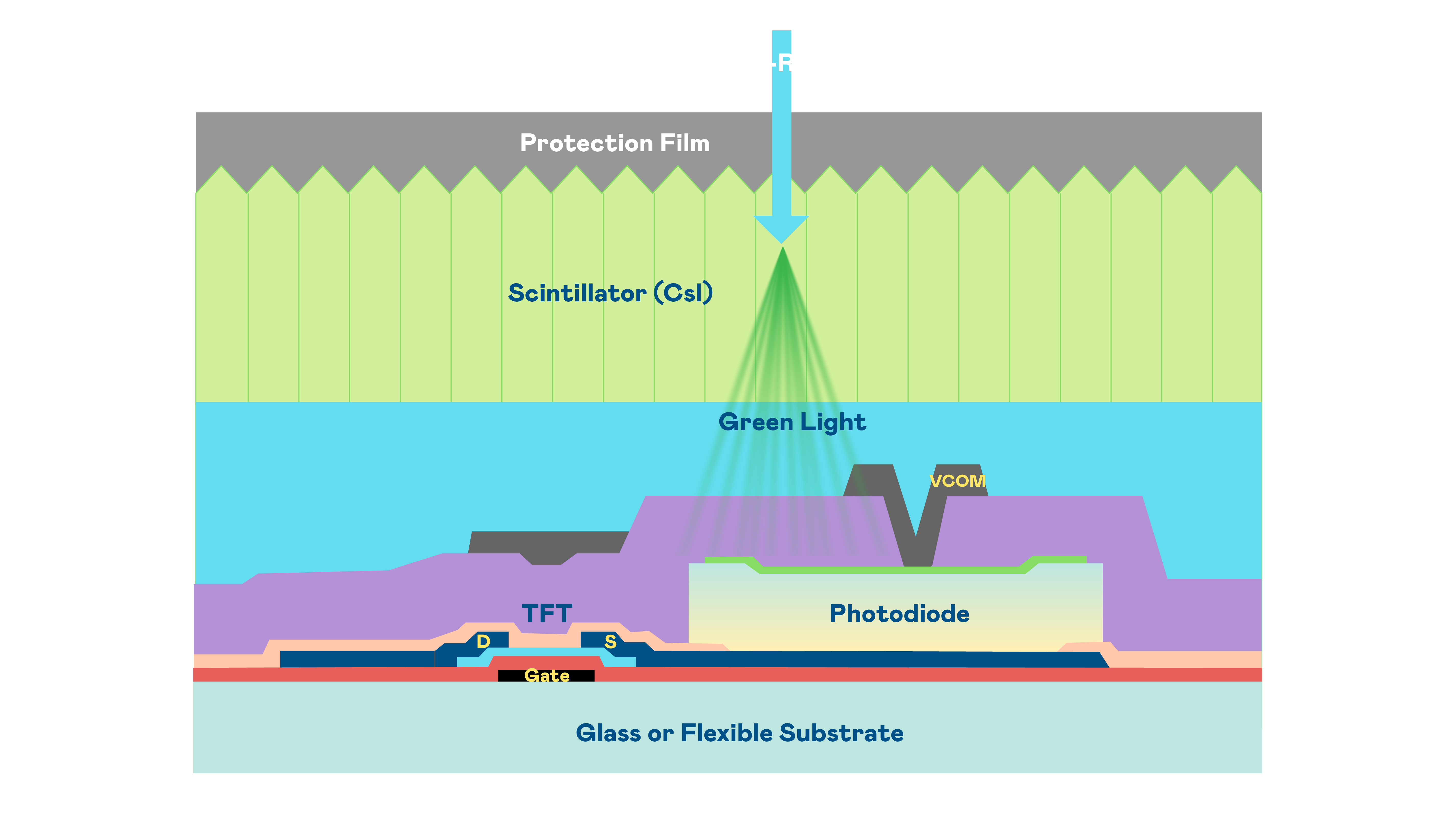 DB旗舰的X光影像感測陣列使用薄膜電晶體 (TFT) 作為每個像素的讀取開關,搭配光電二極體(Photodiode)的光電轉換元件,用以感測X光影像訊號。